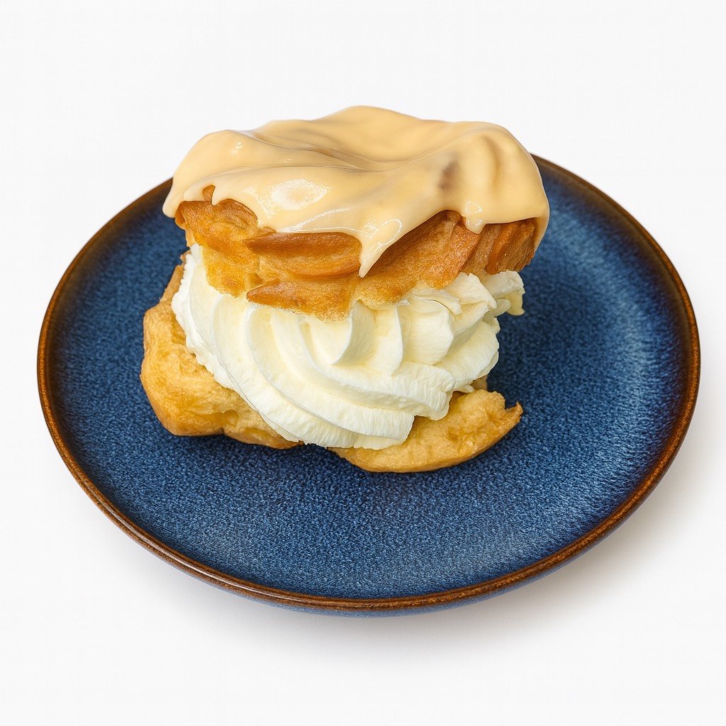 Lehký odpalovaný korpus plněný vanilkovou a karamelovou šlehačkou, na povrchu zalitý karamelovým fondánem.