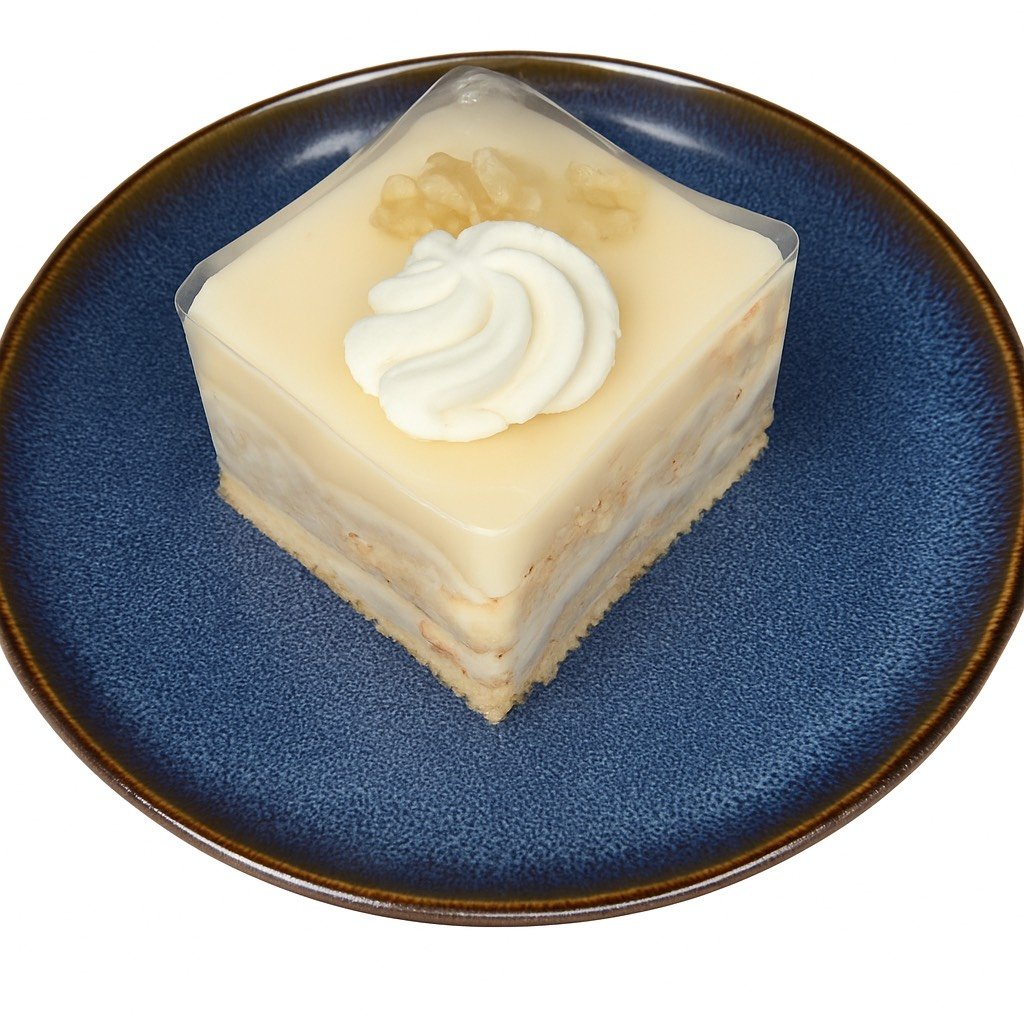 Světlý piškot s jemnou šlehačkou náplní s příchutí bílé čokolády a drcených sušenek, potřené bílou čokoládovou polevou. Dezert připomínající známou chuť, ale v naší domácí verzi.