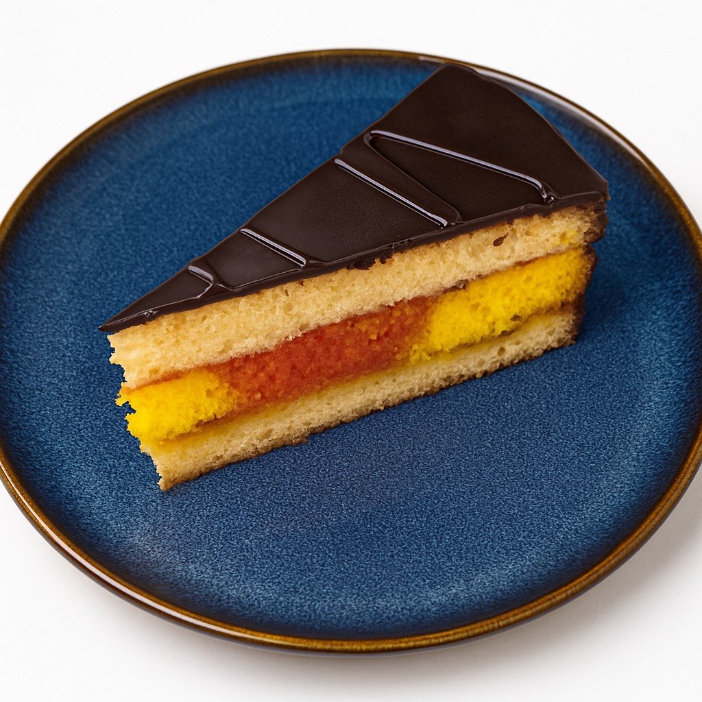 Oblíbený dezert z vláčného piškotu s punčovým sirupem, rybízovým džemem, barevným fondánem a čokoládou na povrchu.