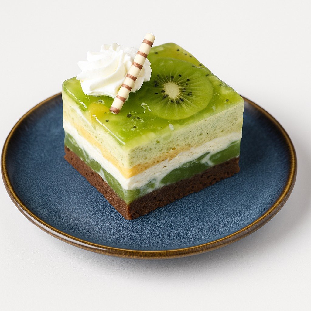 Světlý a tmavý korpus spojený jemnou šlehačkou ochucenou kiwi. Na povrchu kiwi gel s kousky čerstvého ovoce.