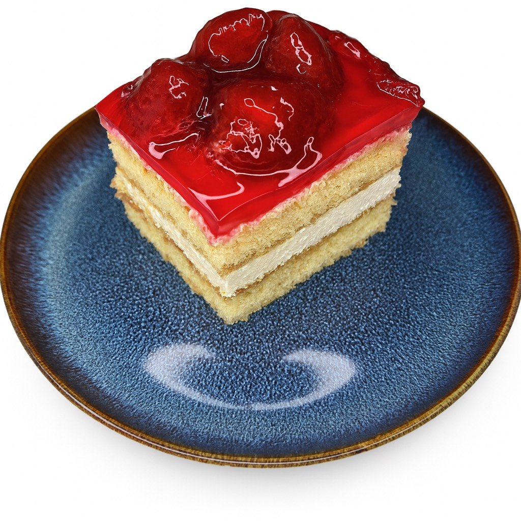 Světlý piškot s jemným jogurtovým krémem a čerstvými jahodami, zalitý jahodovým gelem.