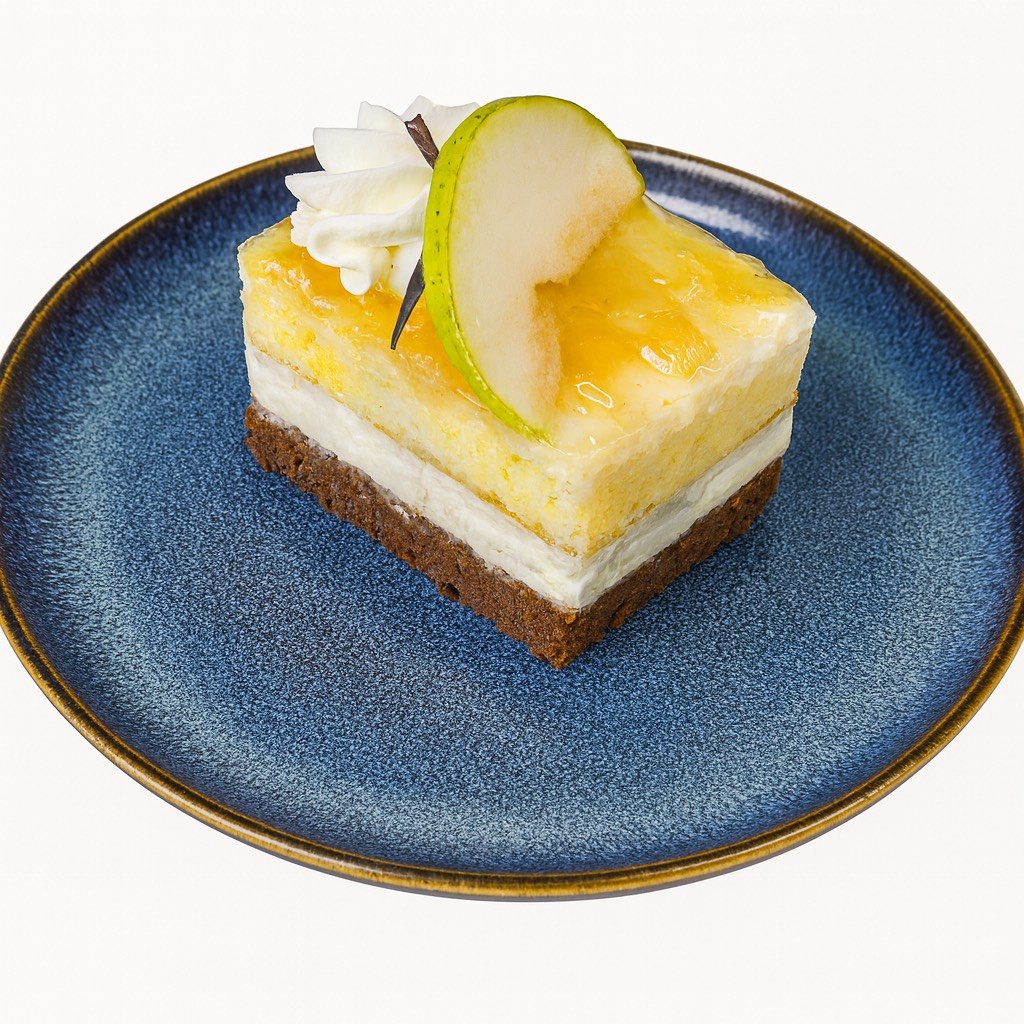 Světlý a tmavý piškot s jemnou šlehačkou ochucenou hruškami, na povrchu hruškový gel.