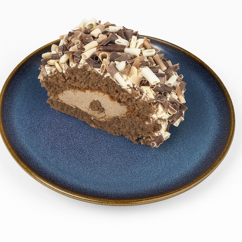 Kakaový piškot s nugátovým krémem, celé obalené jemnými nugátovými hoblinkami.
