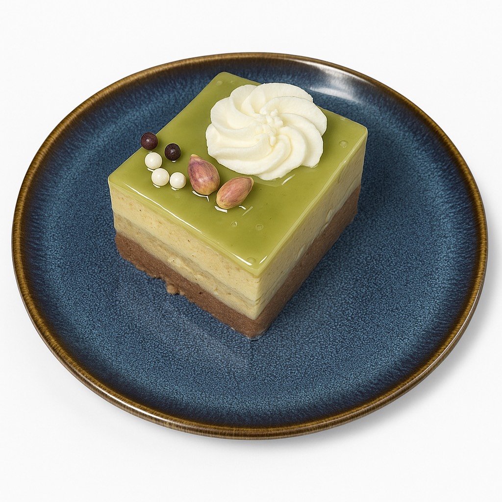 Světlý a tmavý piškot doplněný jemnou pistáciovou šlehačkou a zalitý pistáciovým gelem. Luxusní dezert s jemnou oříškovou chutí.