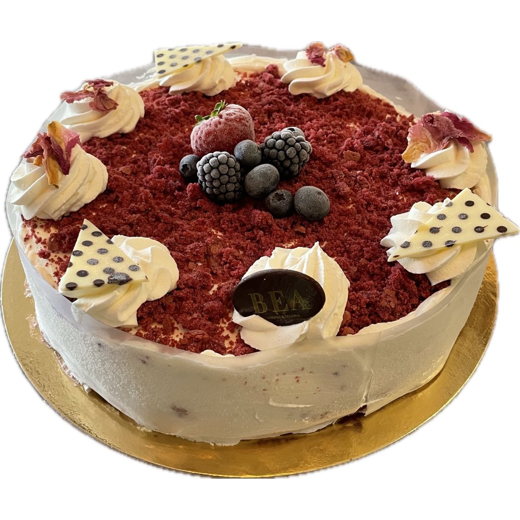 Oblíbený americký dort s výrazně červeným „velvet“ korpusem, jemnou vanilkovou šlehačkou a malinami pro svěží kontrast.
