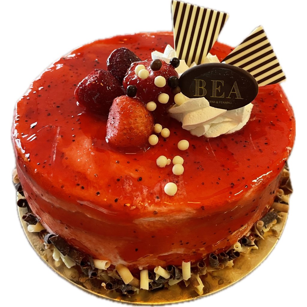 Vanilkový korpus s jahodovou šlehačkou a jahodovou polevou. Ideální volba pro milovníky jahod.