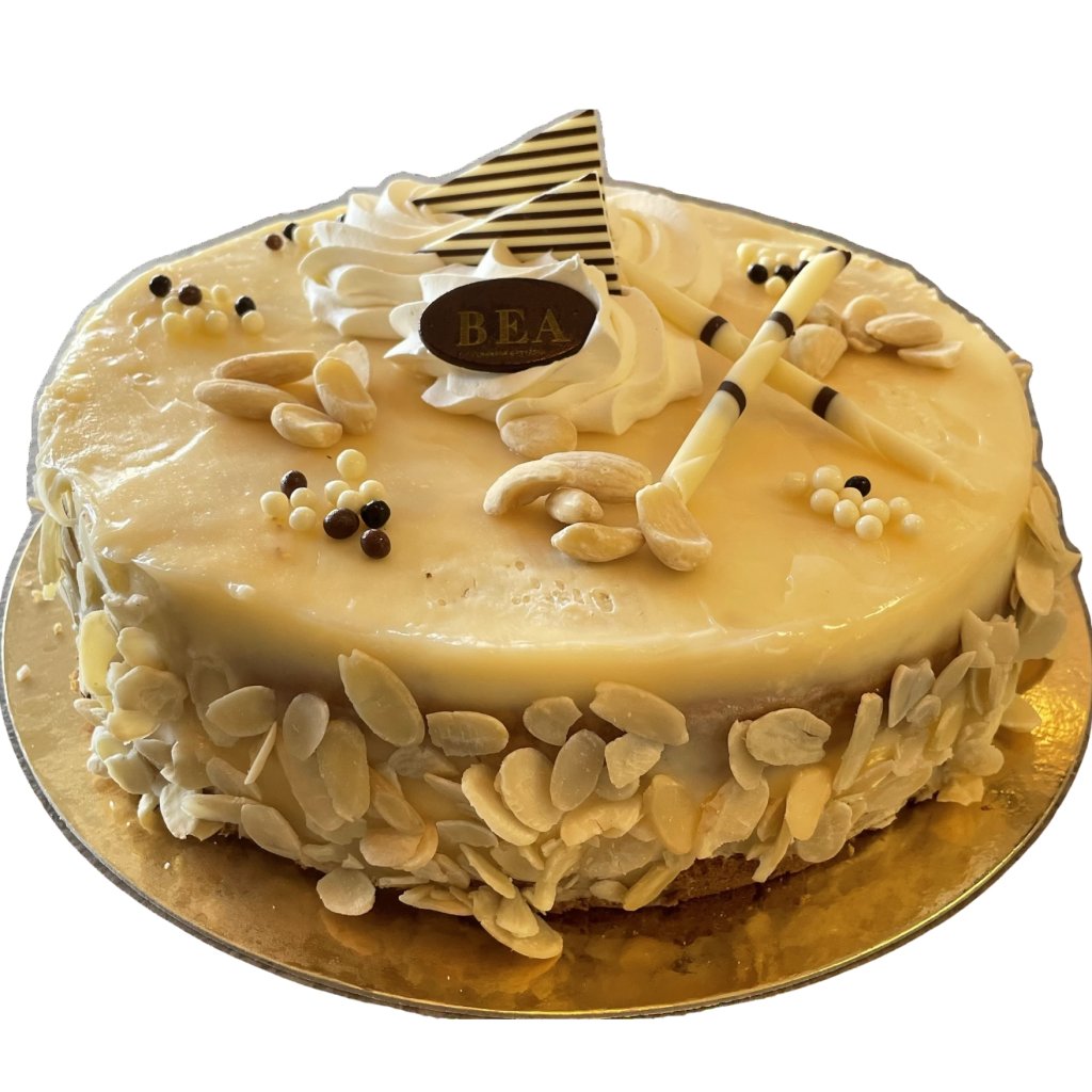 Světlý piškotový korpus plněný jemnou šlehačkovou náplní s příchutí bílé čokolády a nadrcenými sušenkami. Povrch dortu je potažený bílou čokoládovou polevou. Lehký a sladký dezert inspirovaný oblíbenými pralinkami Raffaello.