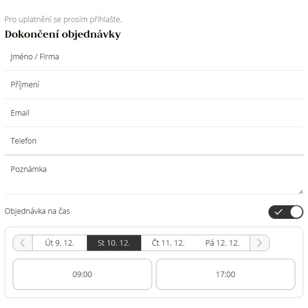 Před dokončením objednávky v košíku vyberte možnost Objednávka na čas a vyplňte datum, kdy budete chtít objednávku vyzvednout (čas je pouze orientační). Děkujeme.