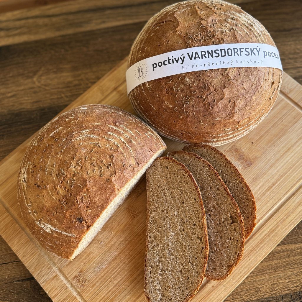 Žitný kvásek, pšeničná mouka chlebová, žitná mouka, kmín, voda, sůl